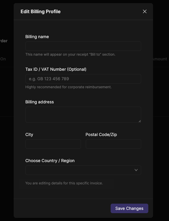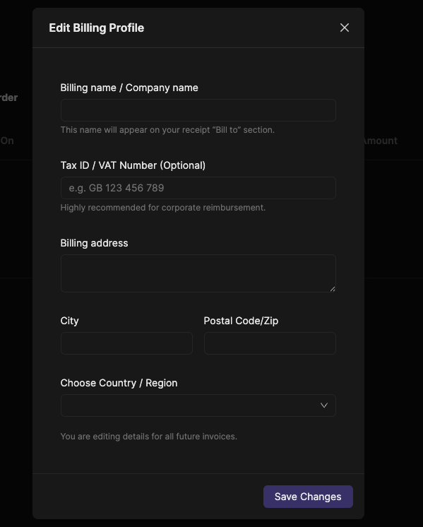 Team Owners can update global billing settings via "Edit Billing Profile".