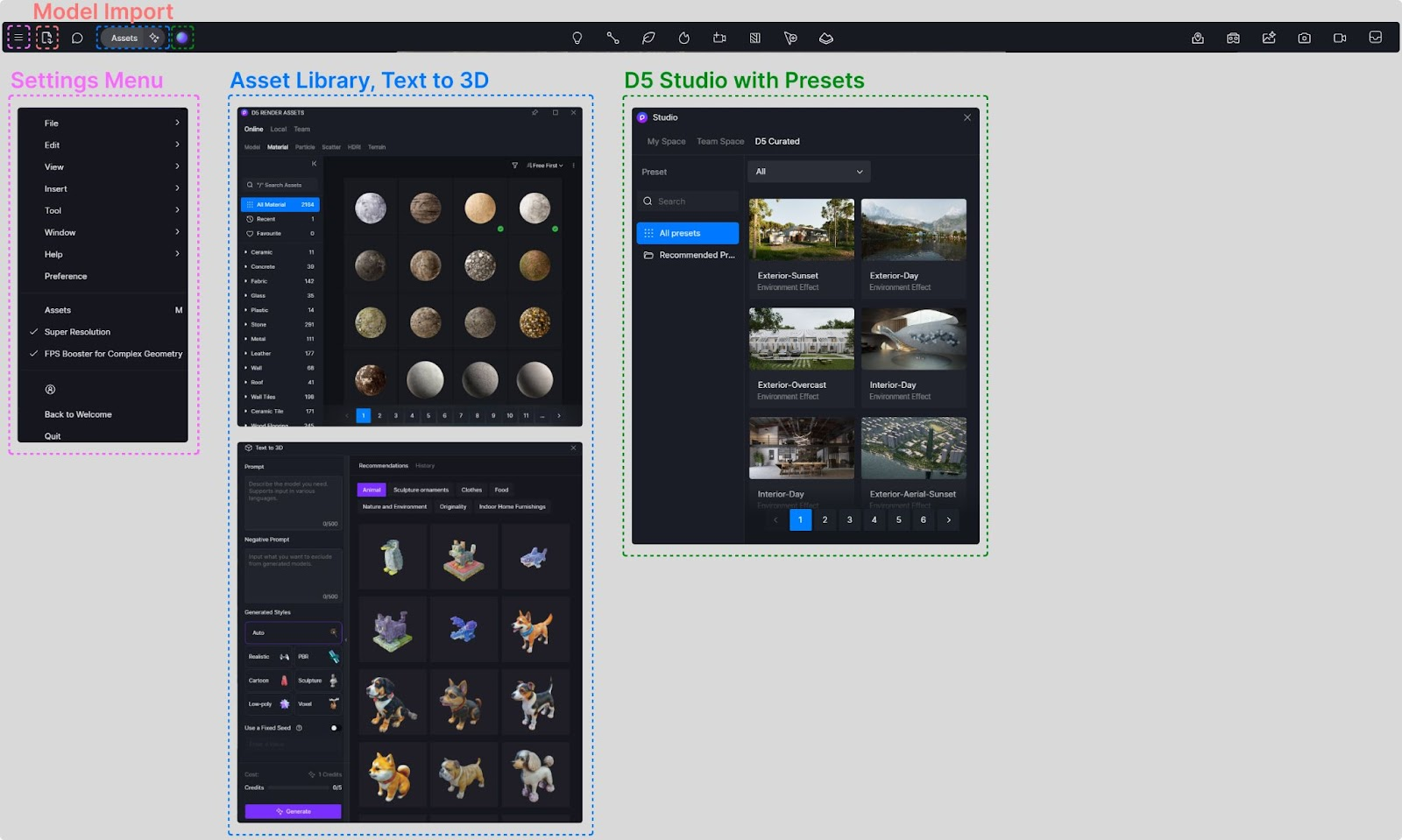 “D5 Studio” is a cloud workspace to store presets for environment, effect, scatter, brush, and path.