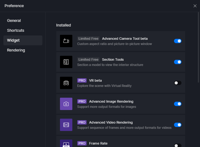 D5 Render also has multiple advanced features in Menu > Preference > Widget, including section tools, stage lights, SR rendering, and VR.