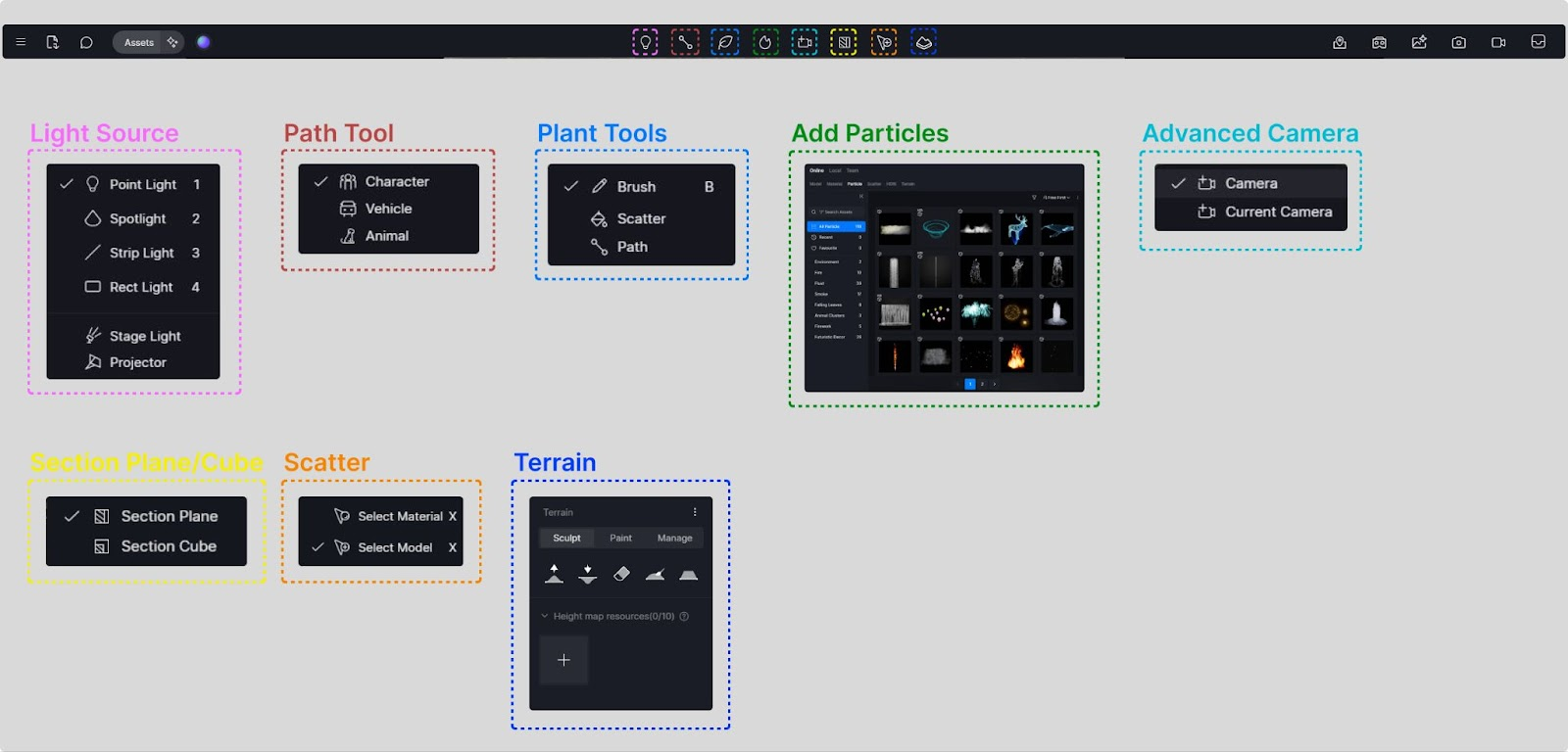 “Asset Library” includes high-quality models, materials, particles, HDRIs, vegetation scatter templates, and terrain templates.