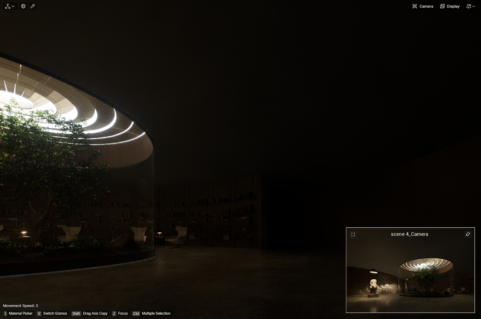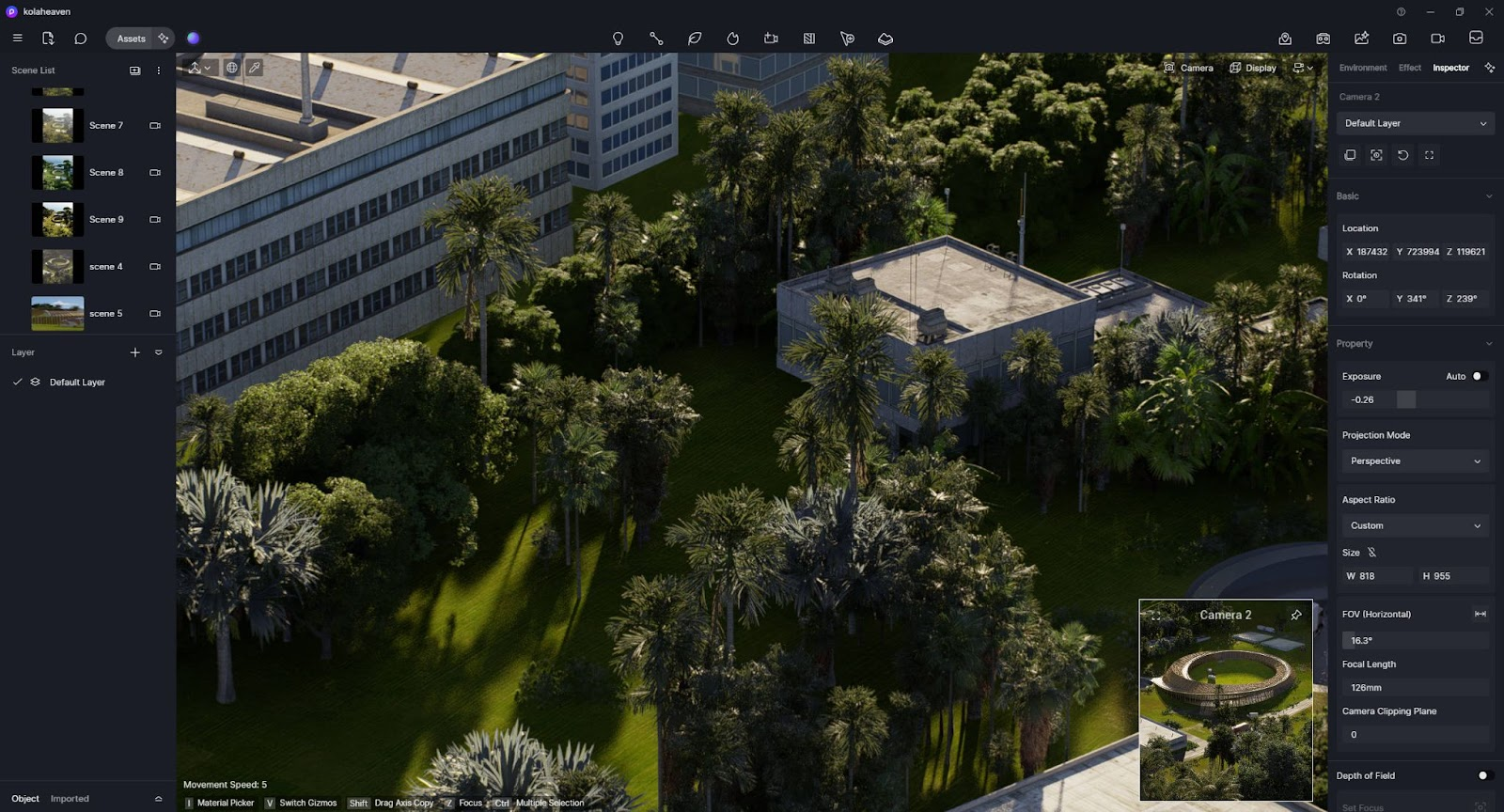 “Advanced camera” supports fixing the camera at a specific angle in the PiP window when you move around in the viewport. Explore more camera settings >