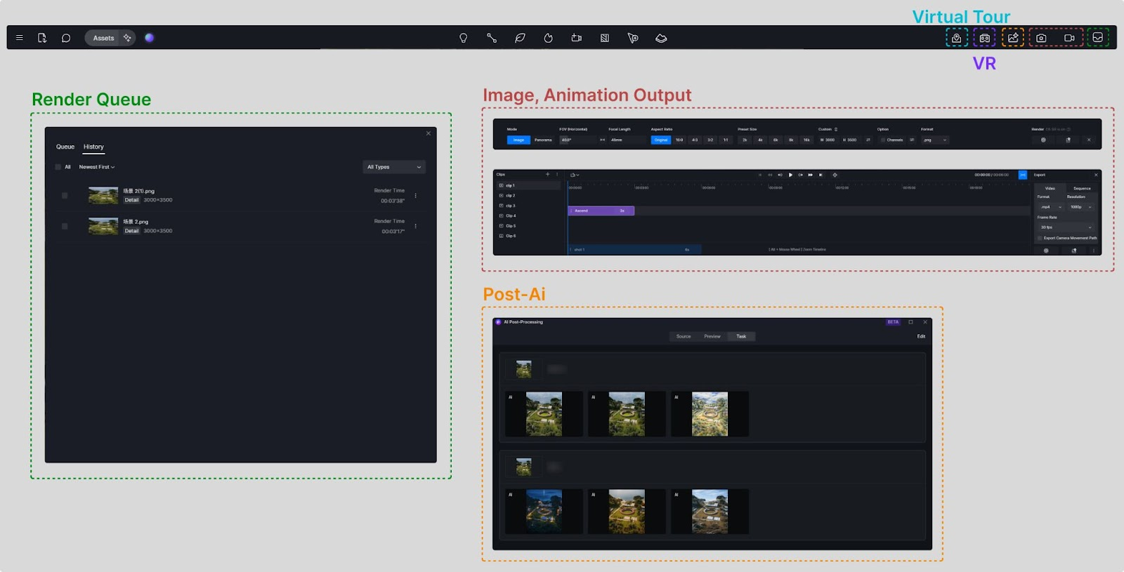 You can export virtual tours, panoramas for VR, image, and animation. D5 supports adding output tasks to the render queue for batch rendering.